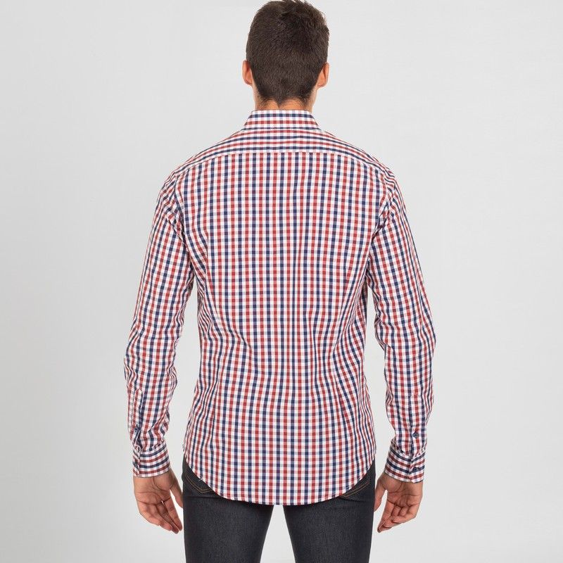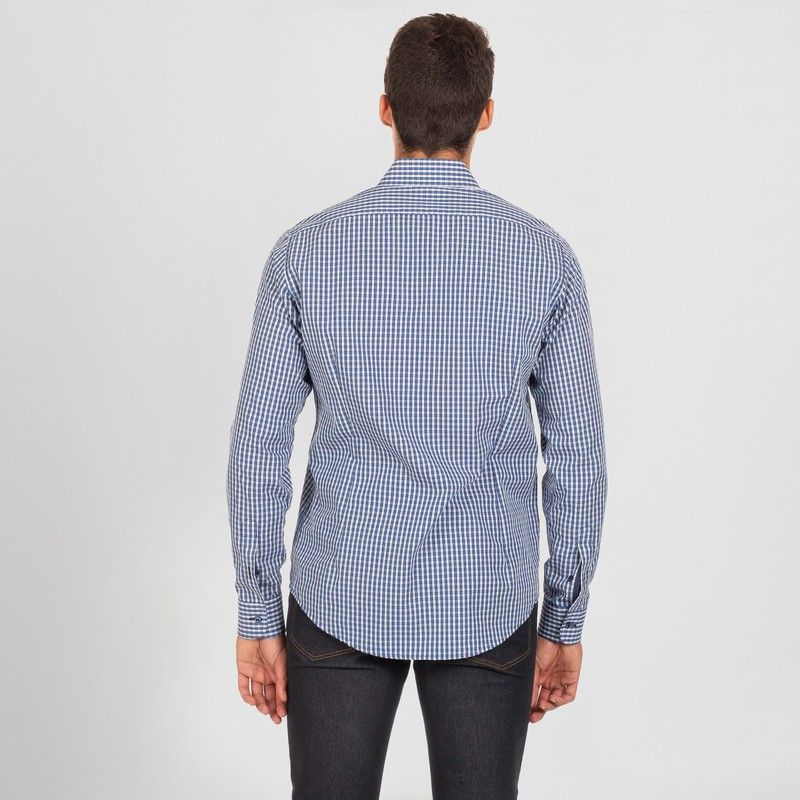 Camisa de hombre en manga larga. Modelo SLIM FIT confeccionado en vichy con puños abotonados, canesú y pinzas en la espalda. Ideal para uniforme de camarero en hostelería y restauración, recepción, oficina o comercio.