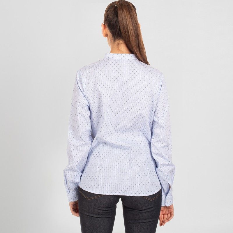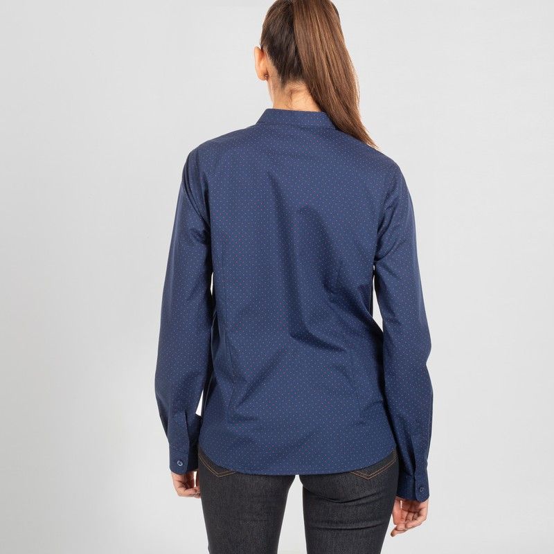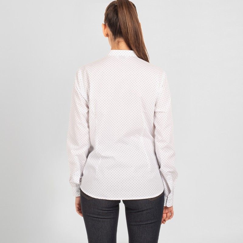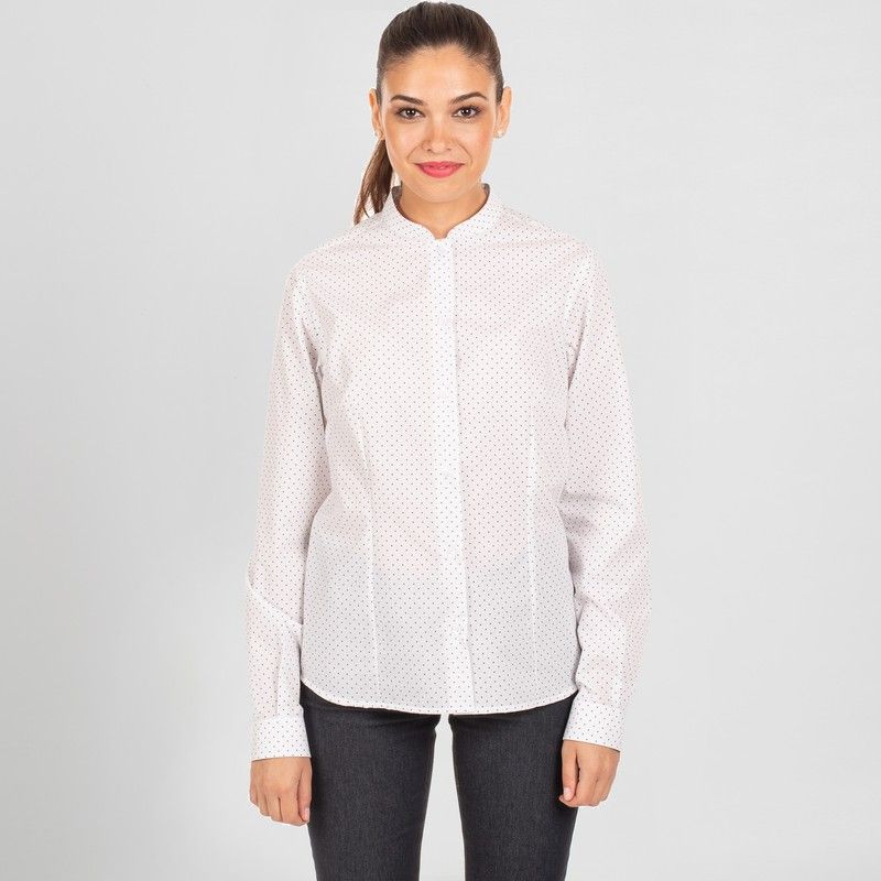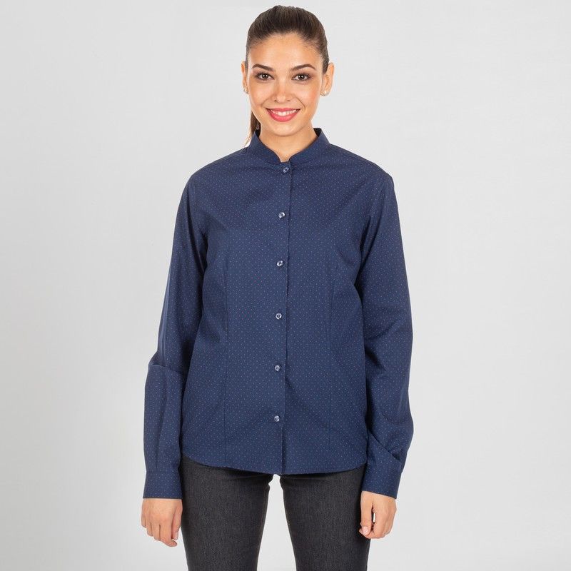 Camisa de mujer en manga larga con cuello mao. Modelo SLIM FIT disponible en diversos estampados de punteados, topos o gaviotas. Cuenta con puños abotonados y pinzas en los costados, delantero y espalda. Ideal para uniformes en hostelería y restauración, recepción, transportes, oficina o comercio.