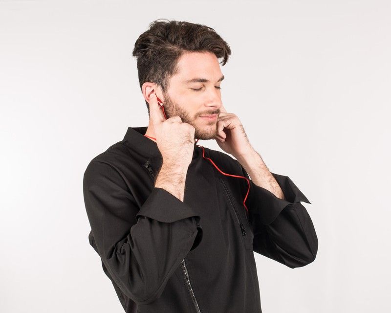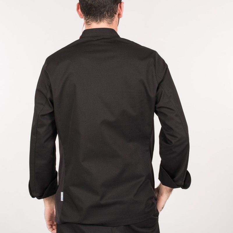 Chaqueta GASTROCHEF unisex, en manga larga, con puños vueltos, cuello mao, cierre cruzado mediante cremallera vista, un bolsillo en manga izquierda y otro con cremallera y abertura para auriculares en pecho izquierdo. Modelo semi ajustado, con costadillos en espalda. Confeccionada en SARGA de color negro. Es ideal para camareros, cocineros y chefs en hostelería, restauración y cocina en general.