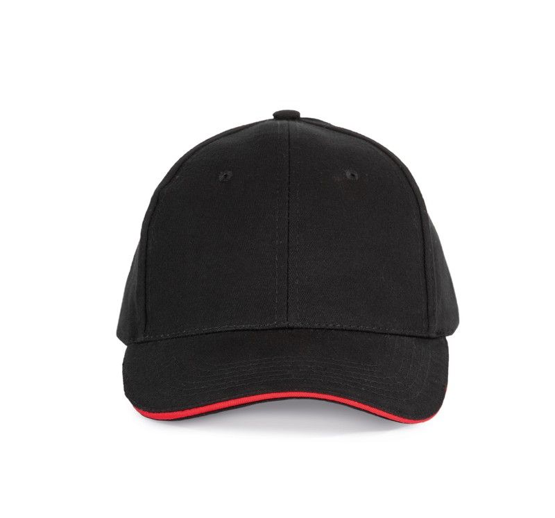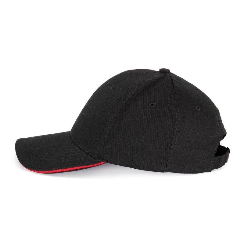 100% Baumwolltwill. Sechs Tafeln. Kontrastsandwich. Verstellbarer Rückenverschluss mit Metallschnalle.