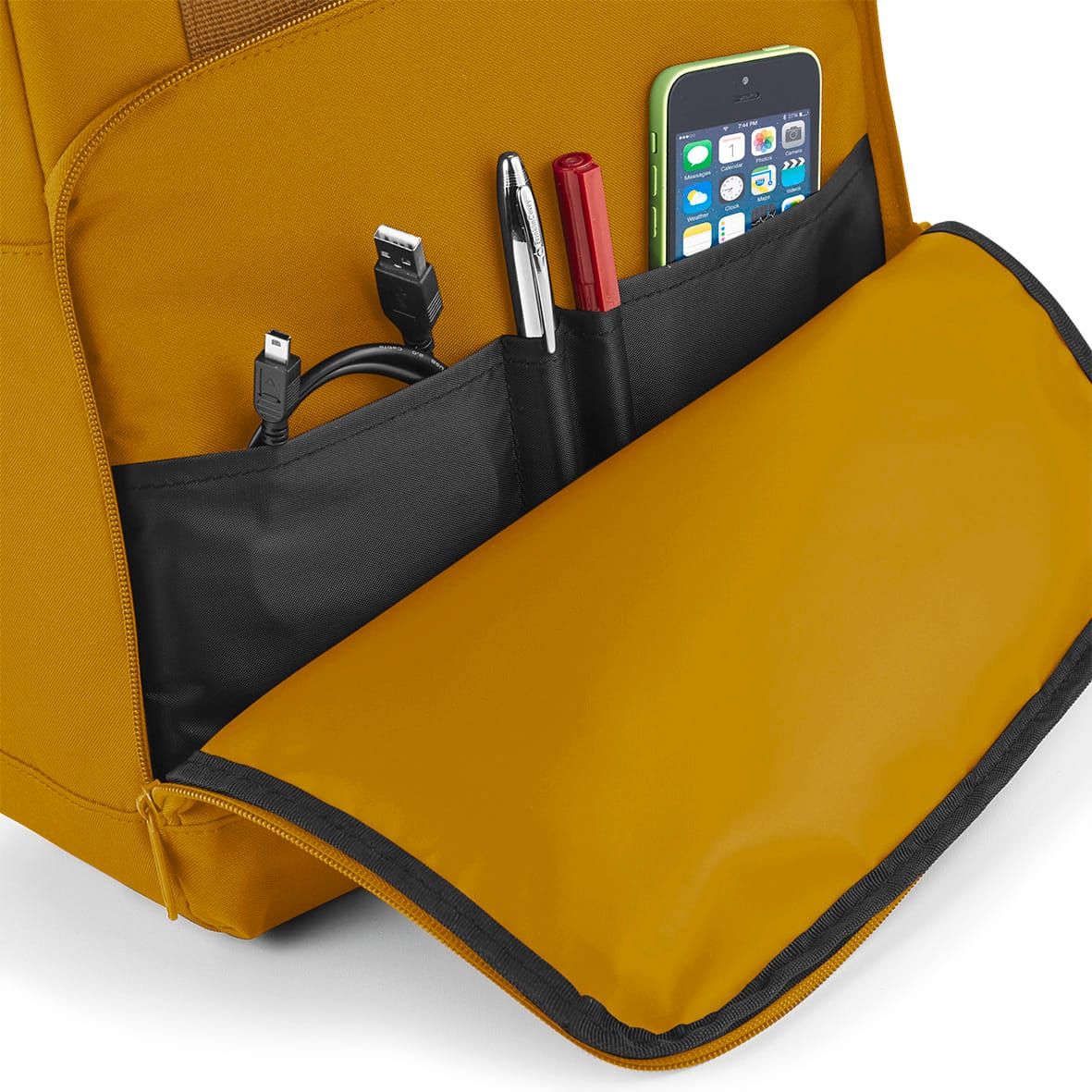 · 100% Polyester (300D) · Griffe · Rollenverschluss · Verstellbare gepolsterte Schultergurte · Gepolsterte Rückwand · Vordere Organizer-Tasche · Interne Reißverschlusstasche · Abnehmbares TearAway-Etikett zur Erleichterung des Rebrandings · Fassungsvermögen: 14 Liter · Abmessungen: 28 x 38 x 12 cm. Max. Stickerei: 15 Rohrrahmen · max. Druckfläche: 24 x 17 cm (Vordertasche).