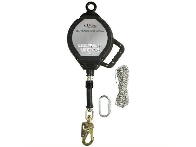 Dispositivo anticaídas fiable con carcasa de ABS y cable de acero de 4,7 mm (30 m). Incluye absorbedor de energía interno y gancho de seguridad giratorio de acero. Hasta 140 kg.