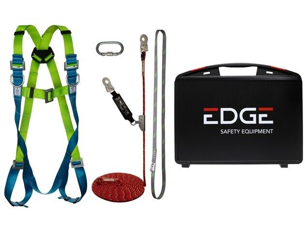 Set completo de seguridad para trabajos en tejados planos, que incluye arnés de cuerpo entero, eslinga de anclaje, mosquetón de acero y maletín de almacenamiento.