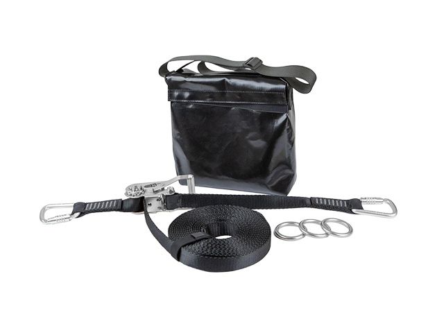 Línea de anclaje horizontal temporal de 20 m para trabajos seguros en altura. Rápida de instalar con trinquete y ganchos giratorios. Homologada para hasta 3 usuarios.