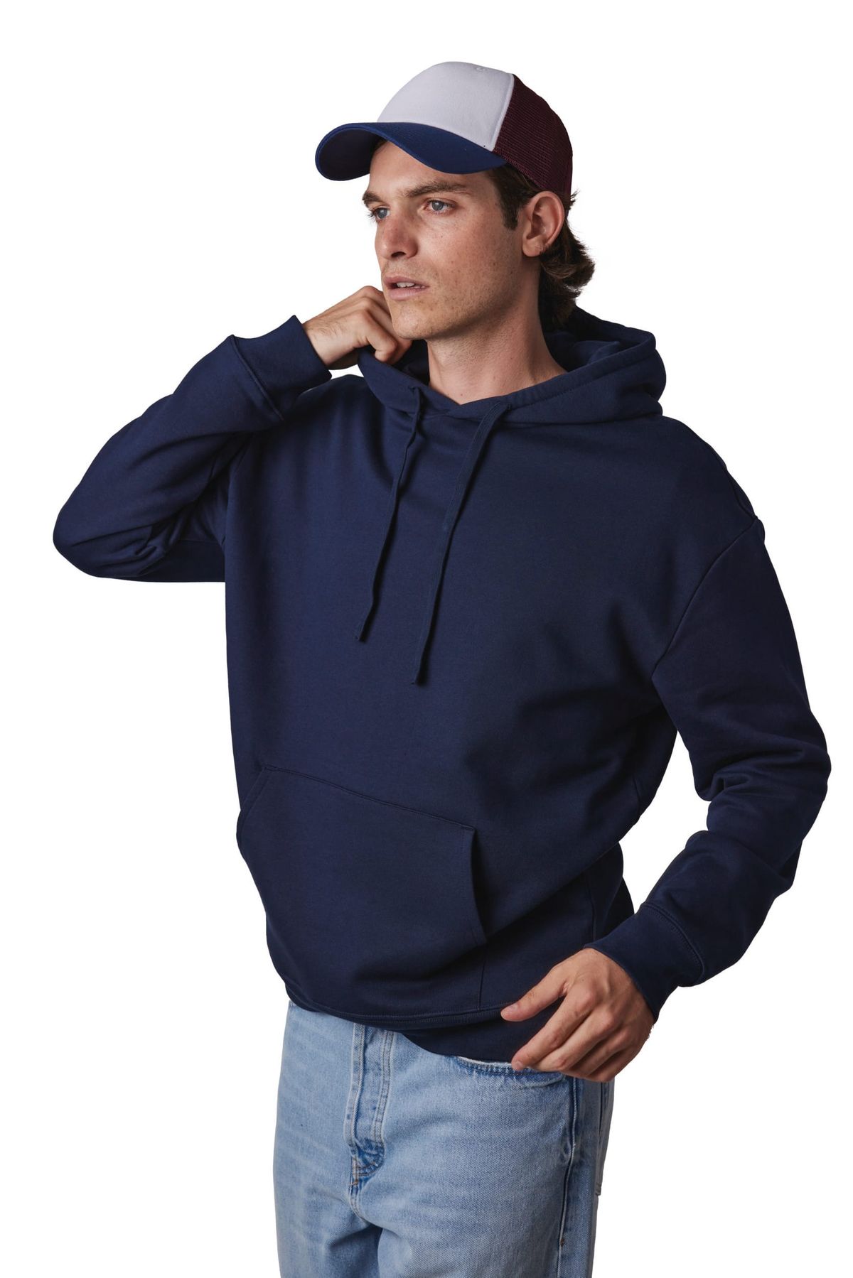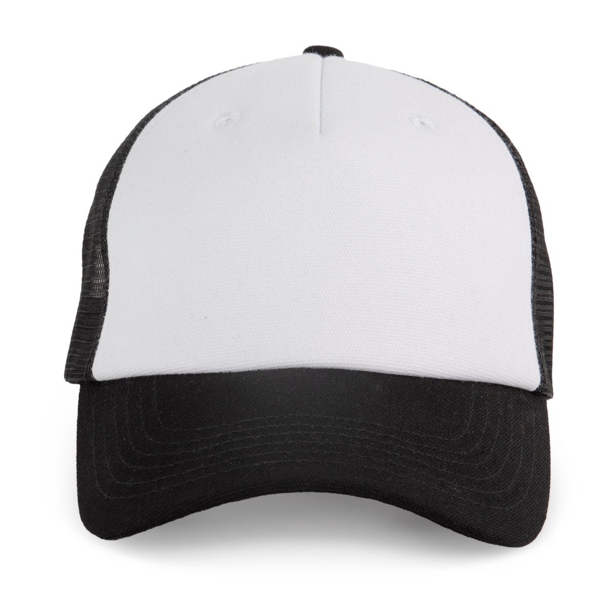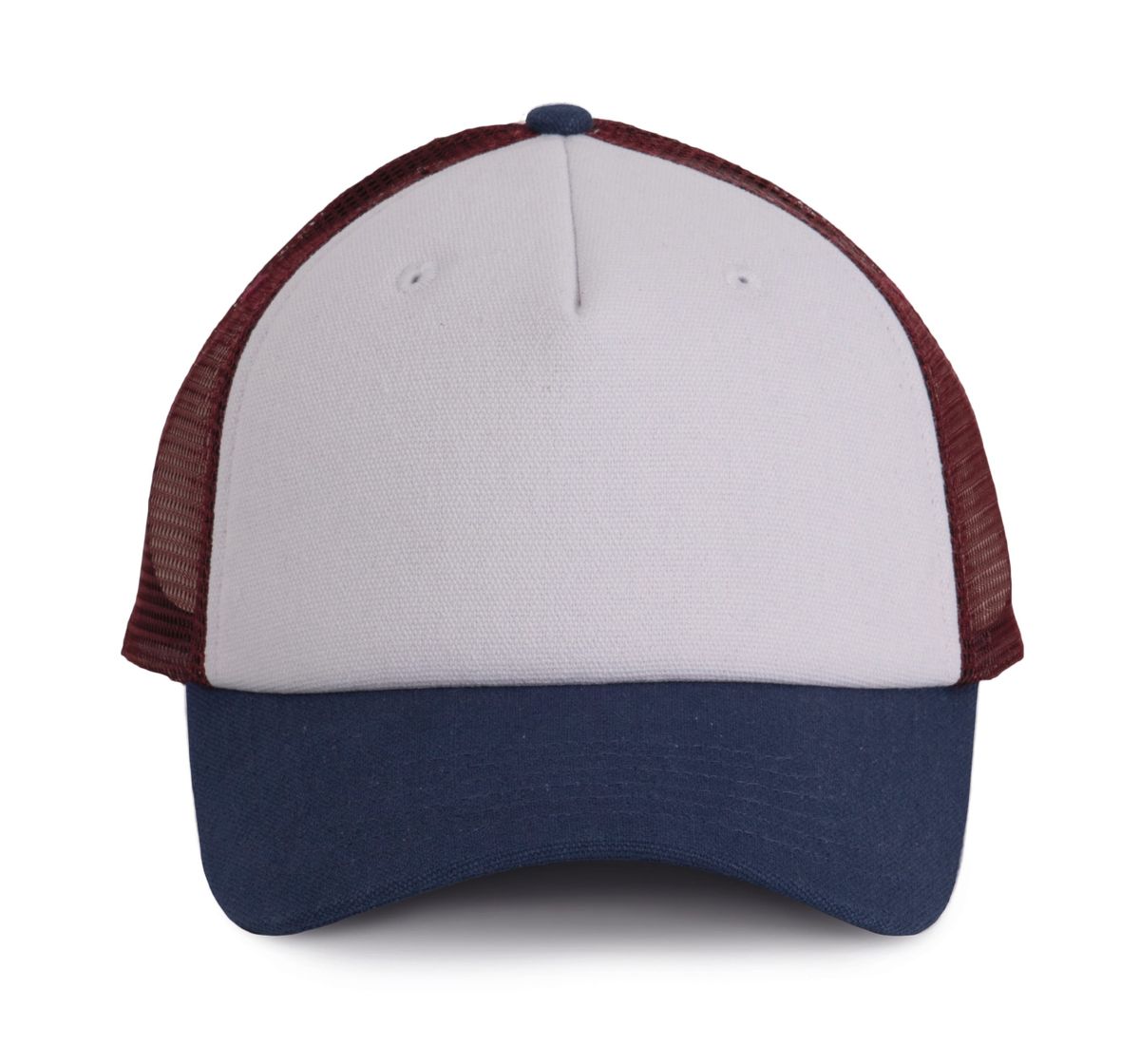 98% Bamwolle / 2% Polyester. 5-Panel-Kappe im Trucker-Stil. Frontpanel und Sonnenschutz-Visor aus Baumwollcanvas und Polyester-Netzstoff. Kunststoffriegel zur Weiteregulierung.