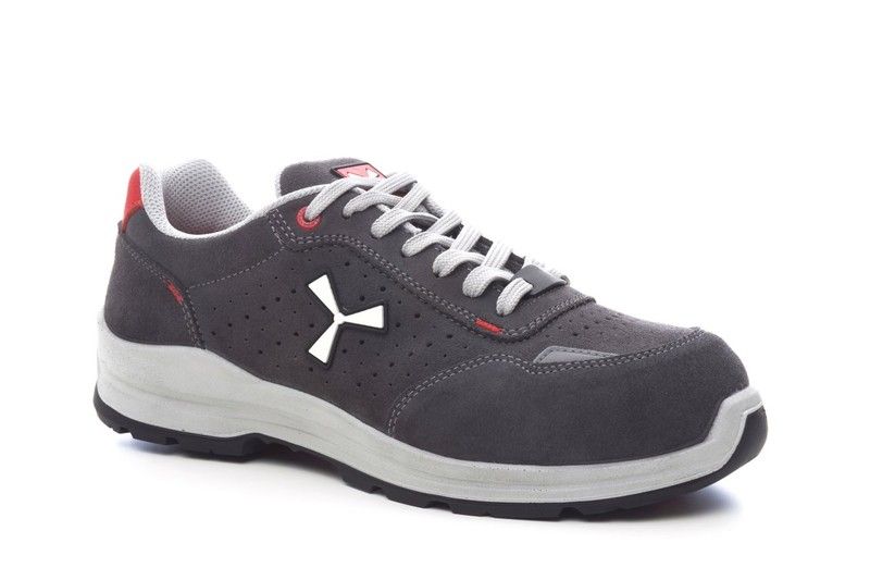 Zapato de seguridad antiestático bajo de hombre, pala de serraje calado repelente al agua y transpirable, forro interior (en toda la superficie interna) transpirable y resistente a la abrasión, 1+1 ojales sin metal y 6+6 agujeros para los cordones reforzados, inserciones reflectantes en el protector de tacón y en el lado exterior de la punta, puntera de aluminio moldeado a presión, plantilla extraíble Ortholite X40 016, plantilla de lámina textil certificada antiperforación, cambrillón antitorsión, base de la puntera con forma de herradura, entresuela de poliuretano ultraligero, amortiguador MASTER BALANCE en PU poliéter de alta tenacidad y densidad equilibrada, suela XTRAIL GRIP en TPU con protector de tacón y de punta.